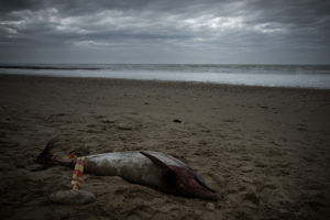 « Les dents cassées sur ce rostre, c’est sans doute une blessure d’origine humaine », estime Jean-Roch Meslin, correspondant du Réseau national échouages sur l’île de Ré, tout en examinant une femelle échouée. Certaines carcasses présentaient des plaies béantes ou des traces sur les nageoires, ont constaté les journalistes de l’AFP.
